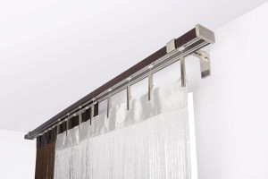 Он также может быть интерпретирован, как карниз трехрядный. Чаще всего такой держатель оснащен липкой лентой, непосредственно к которой и крепиться ткань